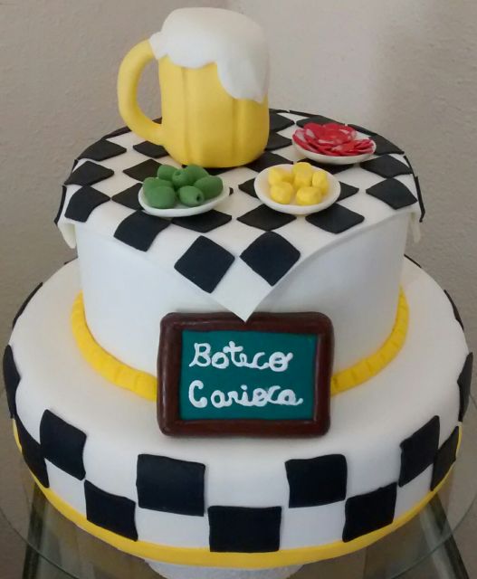 Se você prefere um bolo mais sofisticado, pode encomendar um bolo personalizado. Neste bolo de dois andares os detalhes foram feitos com a pasta americana. O bolo traz uma mistura de elementos do tema festa de boteco.