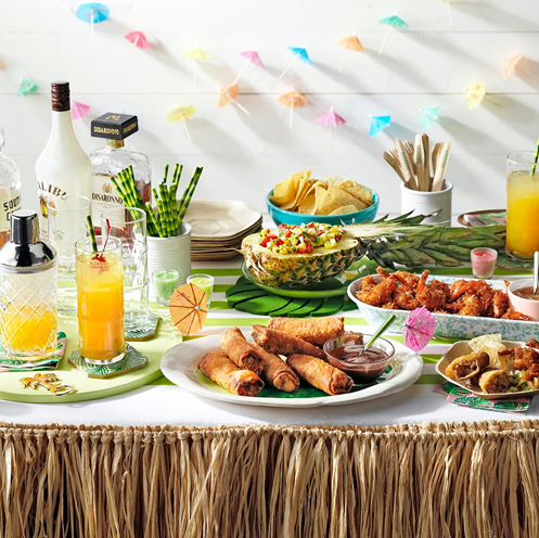 As festas ao ar livre combinam bem com churrascos e sobremesas frescas, pense em espetos de frango e travessas de frutas exóticas. Espetos de abacaxi grelhado com presunto ou carne, camarão, salada frescas, mini sanduíches havaianos. O importante é que o menu deve ser mantido leve e fresco. Pode ser qualquer coisa que você goste e que funcione bem junto! Seja criativo e compre uma variedade de petiscos de festa para seus convidados fazerem um lanche durante a noite.